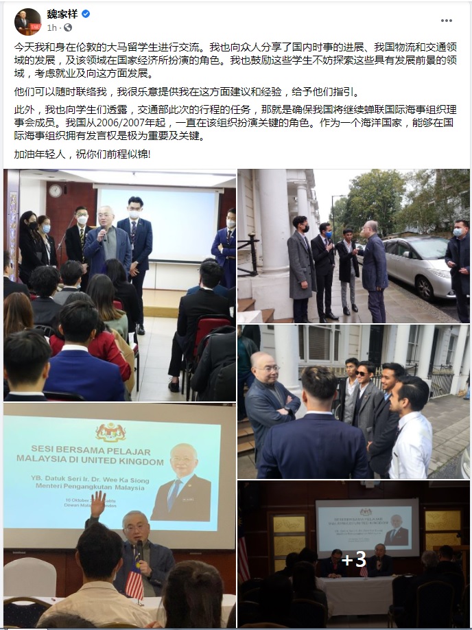 (吉隆坡17日讯)交通部长拿督斯里魏家祥今日在英国进行工作访问时,与在伦敦的大马留学生进行交流,分享了国内时事的进展、我国物流和交通领域的发展,及该领域在国家经济所扮演的角色。