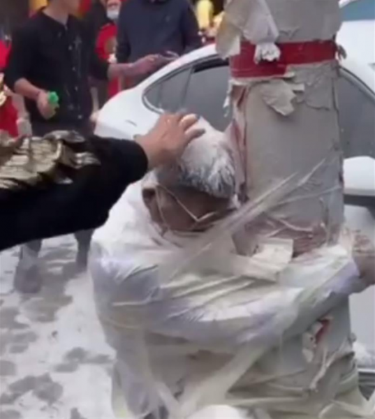 极目新闻报导,网上一段短片显示,山东枣庄市一名新郎在结婚当日被朋友们绑在树上,众人将大包麵粉、汽水往新郎头上倒,两名男子打开灭火器对着他直喷。酒店工作人员称确有此事,后来警察和消防介入处理。