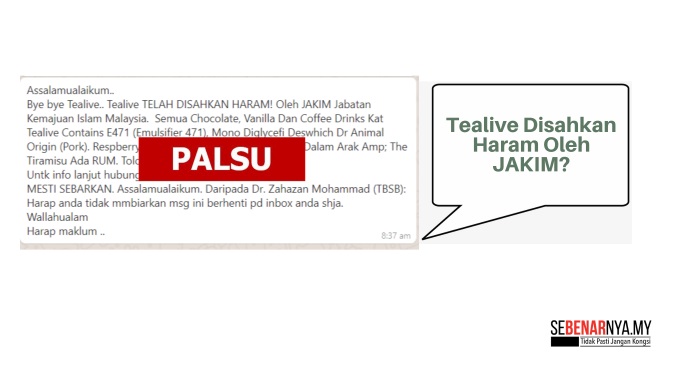 网传一则WhatsApp短讯指Tealive产品含有不清真成分,对此Jakim在其脸书发帖指出,当局近来收到许多有关Tealive清真认证的询问。