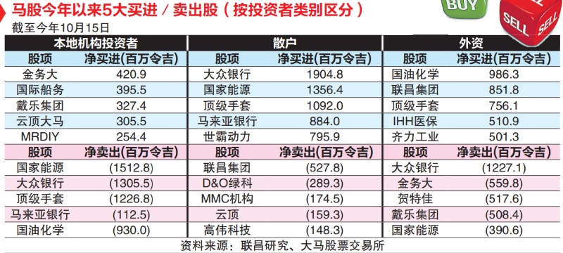不过,有趣的是,机构投资者卖出名单的前5名,即国能、大众银行、顶级手套、马来亚银行(MAYBANK,1155,主板金融服务组)和国油化学(PCHEM,5183,主板工业产品服务组),前4几乎被散户给买下。