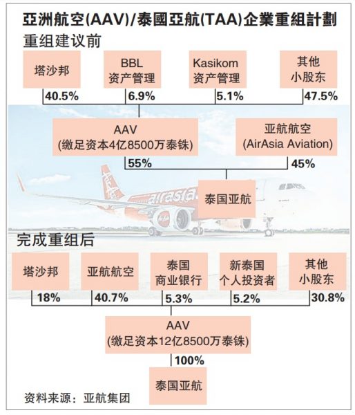 达证券表示,此重组和资本重建计划完成后,亚航集团将从原本持有TAA的45%股权,转为持有AAV的40.7%股权,以继续参与泰国航空业。