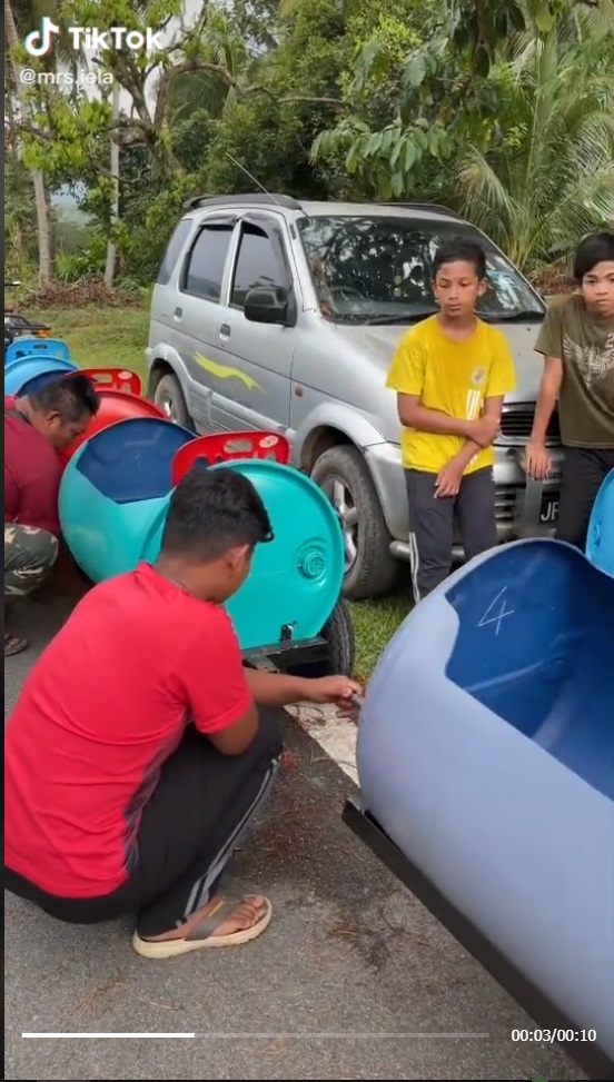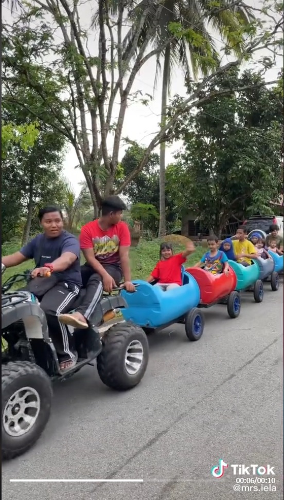 (八打灵再也22日讯)一名来自森美兰州的男子在乡区以水桶改造成“火车厢”座位,再以全地形车(ATV)做车头,让乡区的孩子们能够体会另一番“火车游行”的体验,欢乐不已。