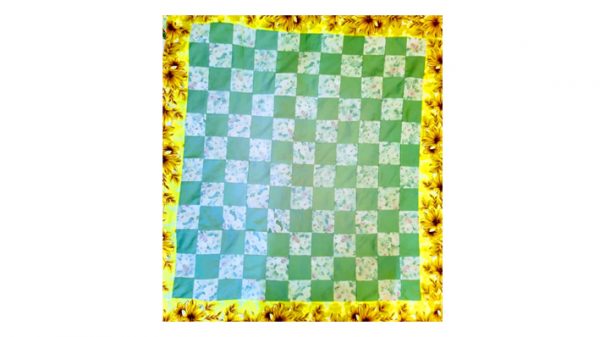 但这一张,没有三角形,只有一格一格的正方形;没有鲜艳的花色,只有朴素的白色和浅绿色;没有车边也没有底面,活脱脱是一张未完成的作品。这到底是母亲还是外婆做的?会不会是母亲做了要拿来当桌布或其他用途呢?记忆中母亲似乎用过拼贴的碎布来铺盖老家那一台黑色的针车,我的大姐现在也用拼贴的百家被单面铺盖她的古董针车……