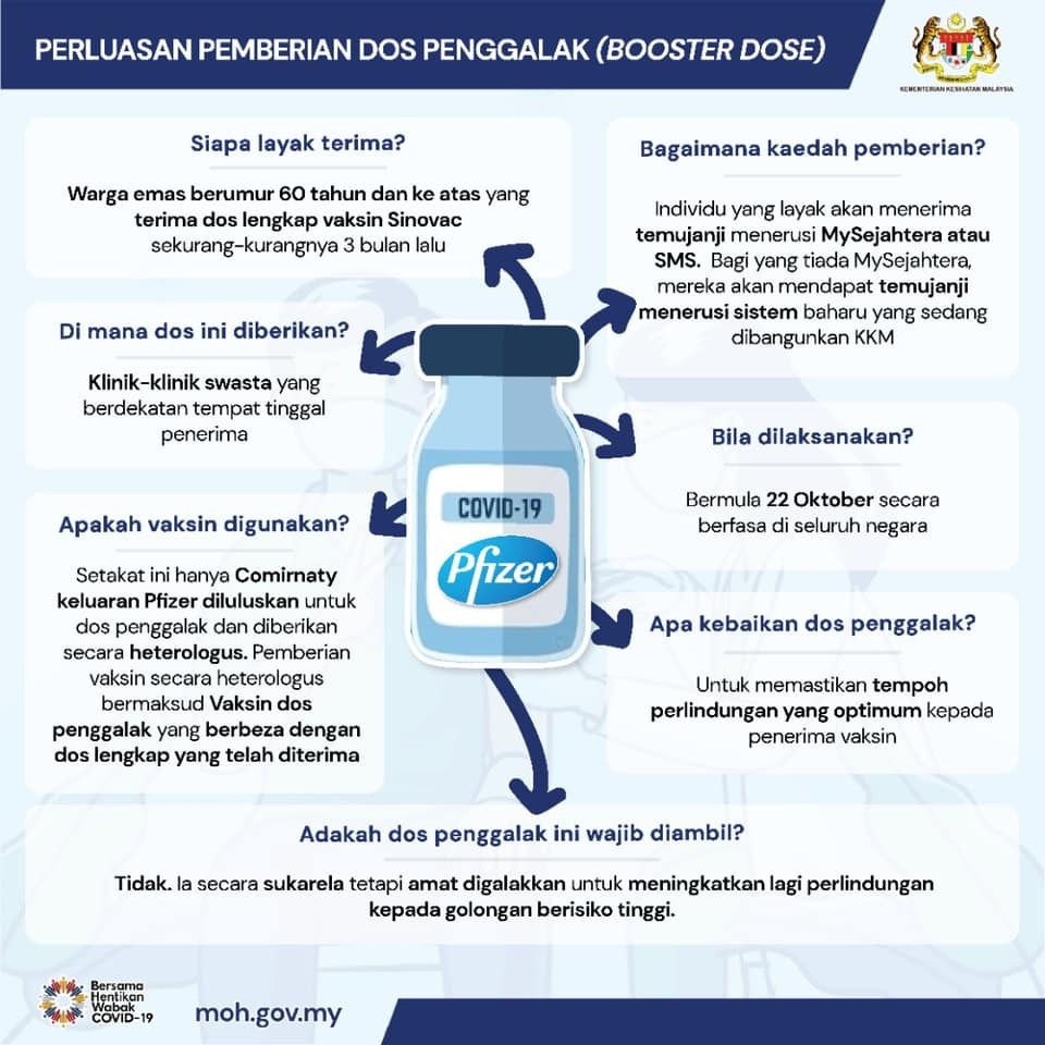 根据卫生部公布的资讯图,符合施打加强针资格的人士将通过MySejahtera手机应用程式或短信收到预约通知;而没有MySejahtera的人,则将通过卫生部正在开发的新系统,获得预约。