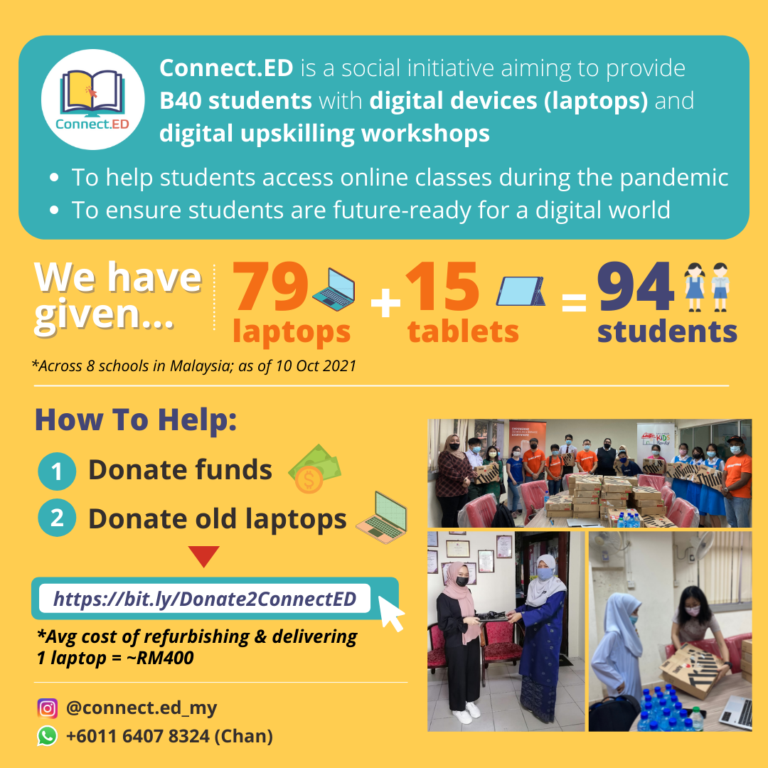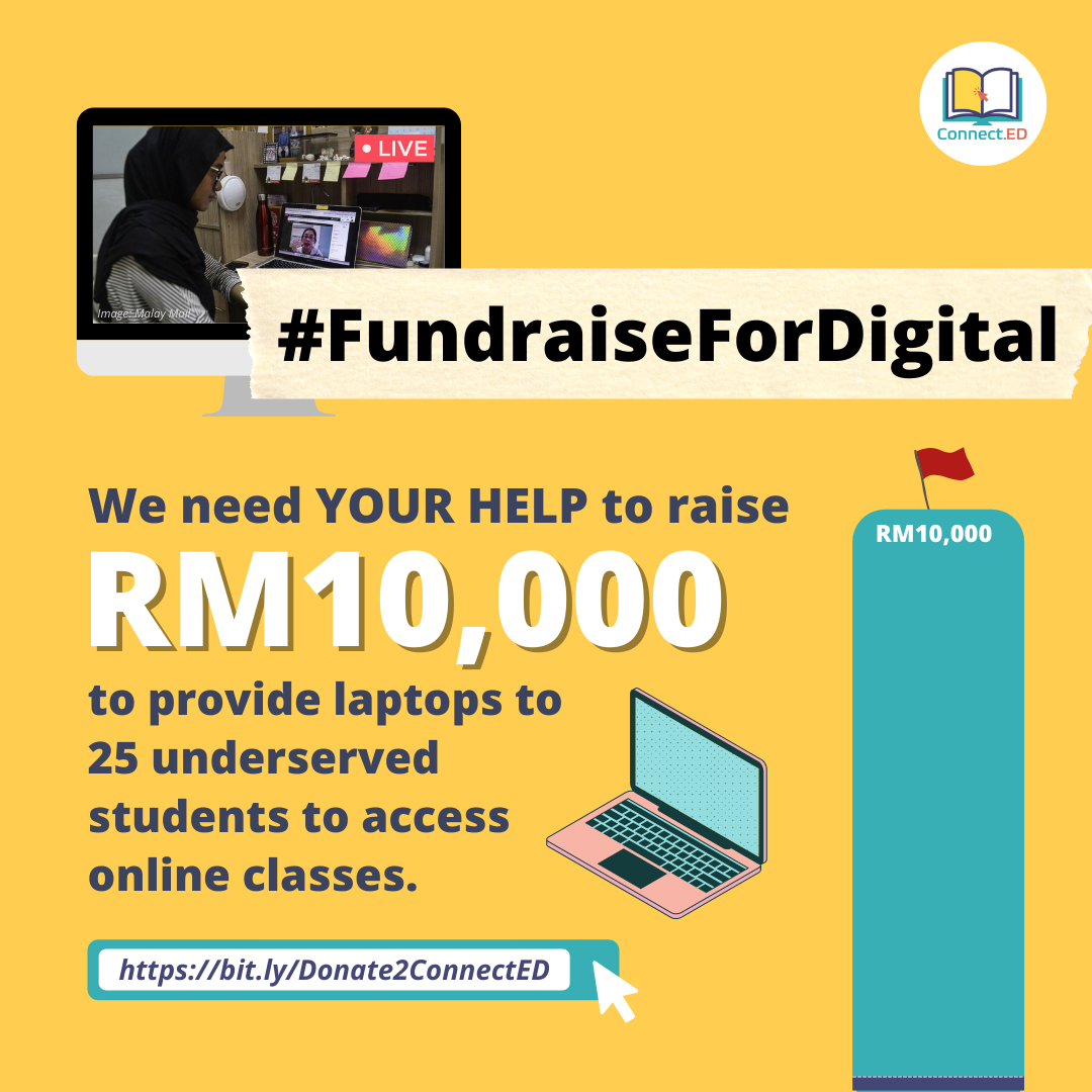 Connect.ED团队现在其中一项新活动为#FundraiseForDigital(为电子设备筹款),主要是在Sedunia筹款招募平台上,筹得1万令吉,用以维修电子设备,协助更多来自B40家庭的学生在这期间可以进行网课。