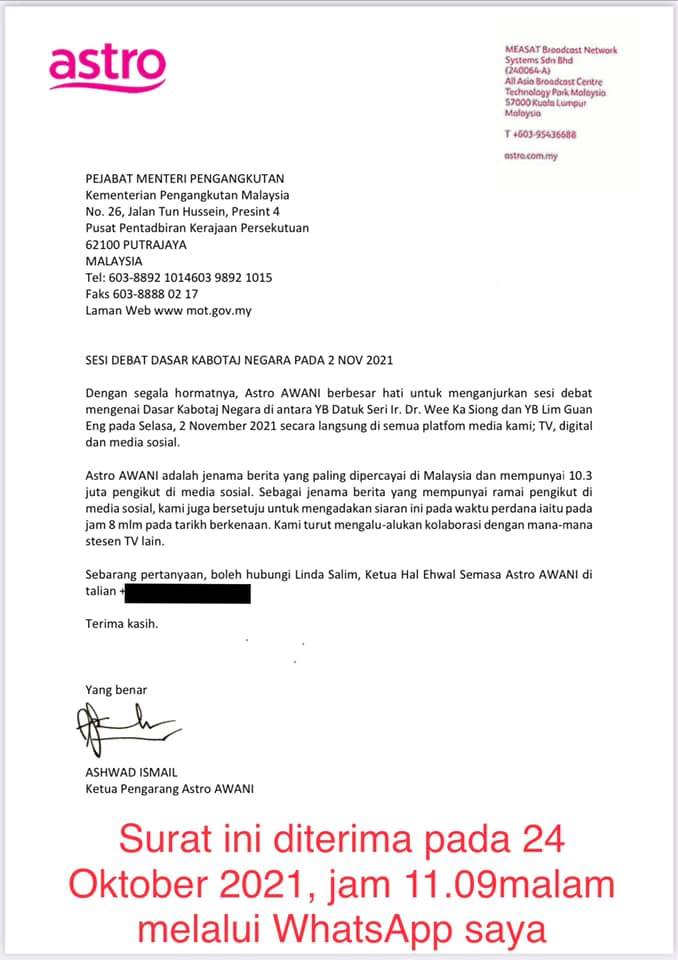 他说,正如他向Astro Awani制作人所表示,第三电视于9月30日在林冠英表示“随时”可以和他进行辩论后,第一时间就联络其办公室,他也答应根据第三电视所提议的11月2日进行辩论,并于10月23日以书信方式回复了邀请函。