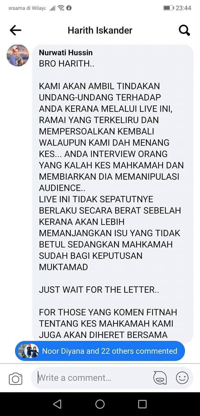 另一名女子也在脸书发文表示要对哈里特喊告,因为他允许已经被判败诉的有罪之人公然地谈论已被法庭审理及判决的案件,以及侮辱他人的尊严与声誉。