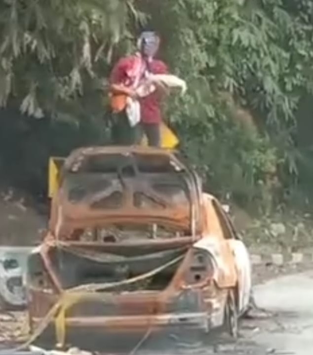 (八打灵再也30日讯)竟然有人在光天化日之下,抱著一块墓碑站在路边一辆烧毁的轿车上,像是作法般了乱舞,令不少公众对他的诡异行为感到恐惧。