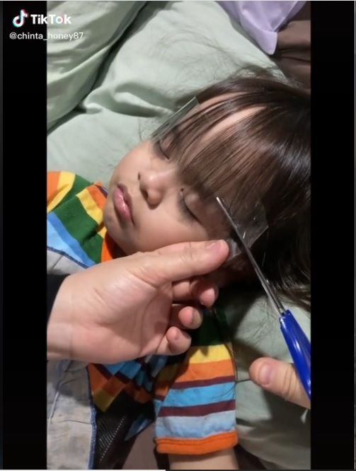 (八打灵再也30日讯)一名母亲想为孩子剪短刘海,但孩子不愿乖乖配合,搞得她每次都像是”打仗“一样,如今她终于学到新技巧,趁孩子熟睡后,用透明胶带固定住孩子的刘海,再一刀剪过,简单且干脆利落!