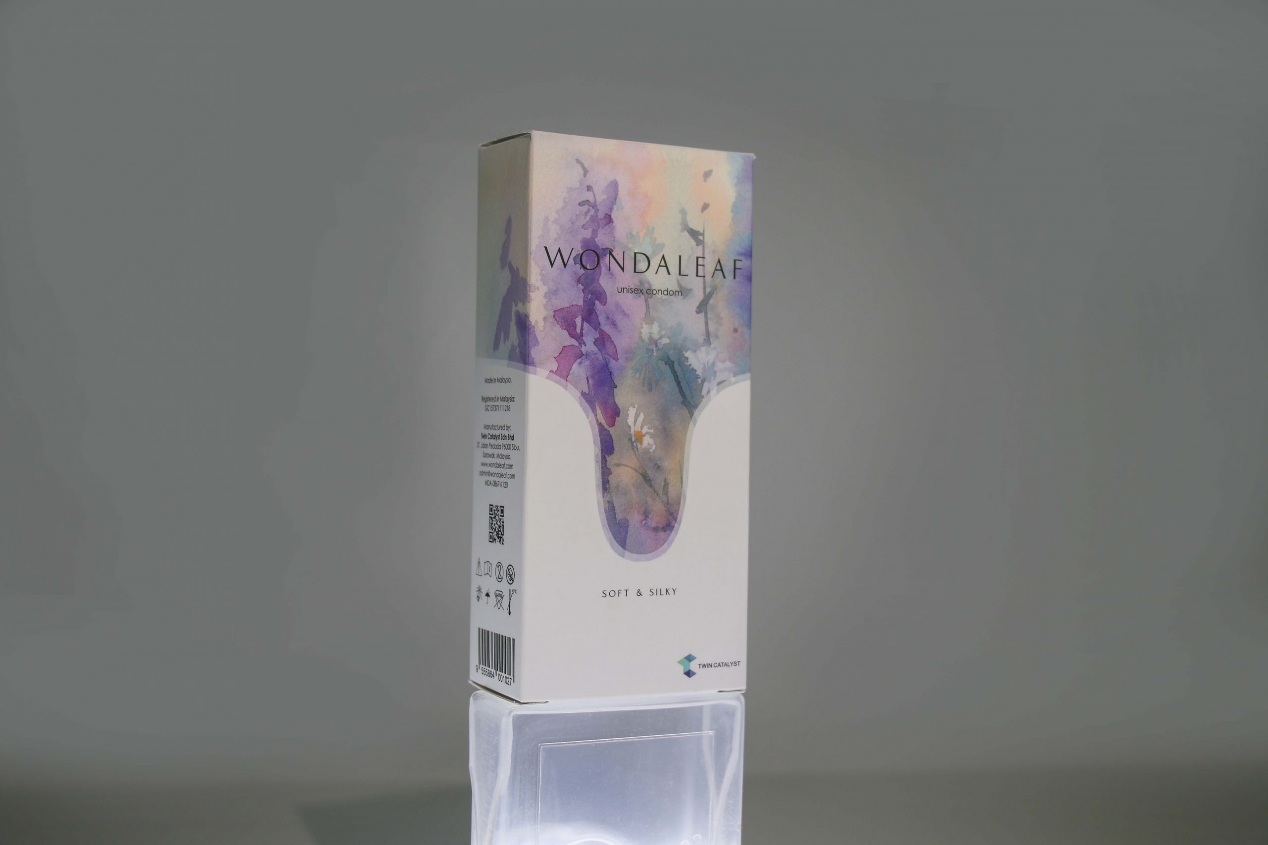Wondaleaf安全套的最初设计是个放在阴道内的小袋,由贴在腹部的粘性护罩和女性体内的保持装置支撑,覆盖会阴区域和下腹部的两个粘性翼。过后,发现可以将其倒置成为外用安全套,从而使男女通用。