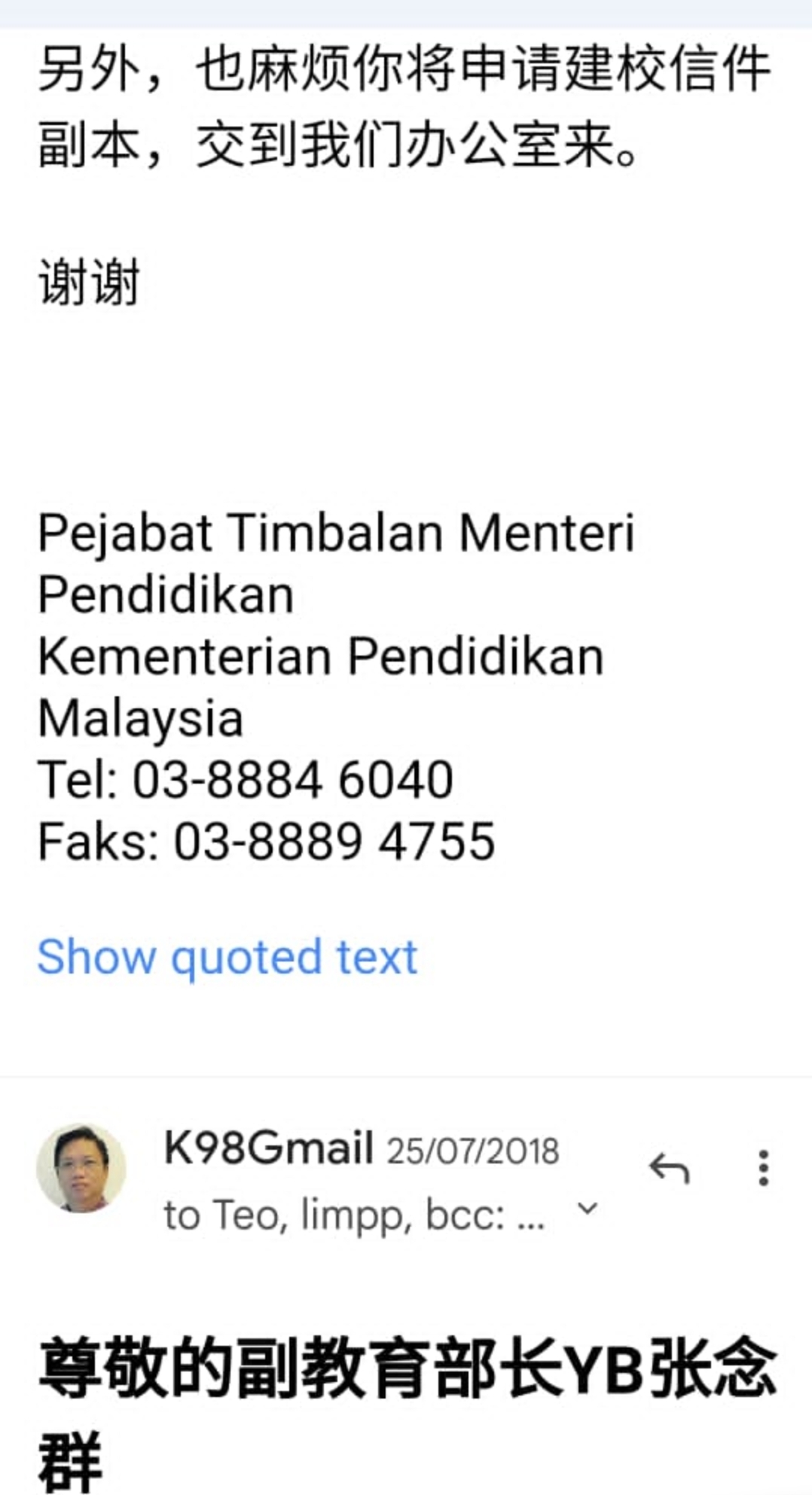 他说,随后他也联络张念群,要求向其报告筹建朱运兴华小的进展,张念群办公室于2018年7月24日通过电邮通知他,朱运兴华小可以继续申办手续,并且要求原建委会和土地与矿务局确定有关地段,并移交给州教育局,再由教育局申请建校批准。