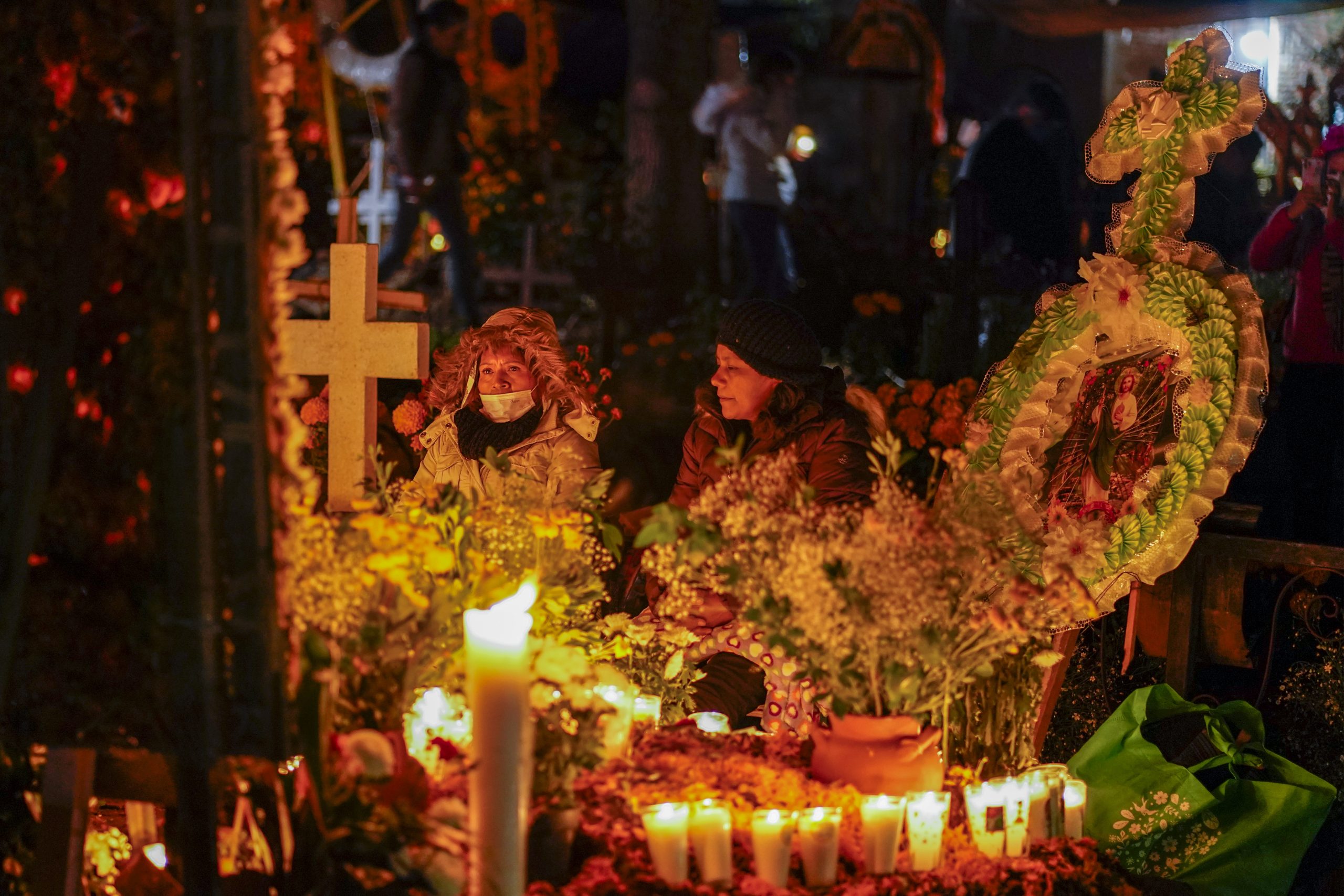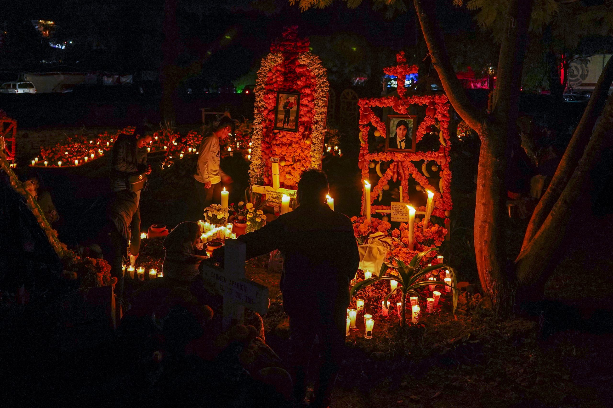 亡灵节的夜晚,墓园不冷清。墨西哥人都会用金盏花和蜡烛装饰已故亲人的坟墓。(美联社照片)