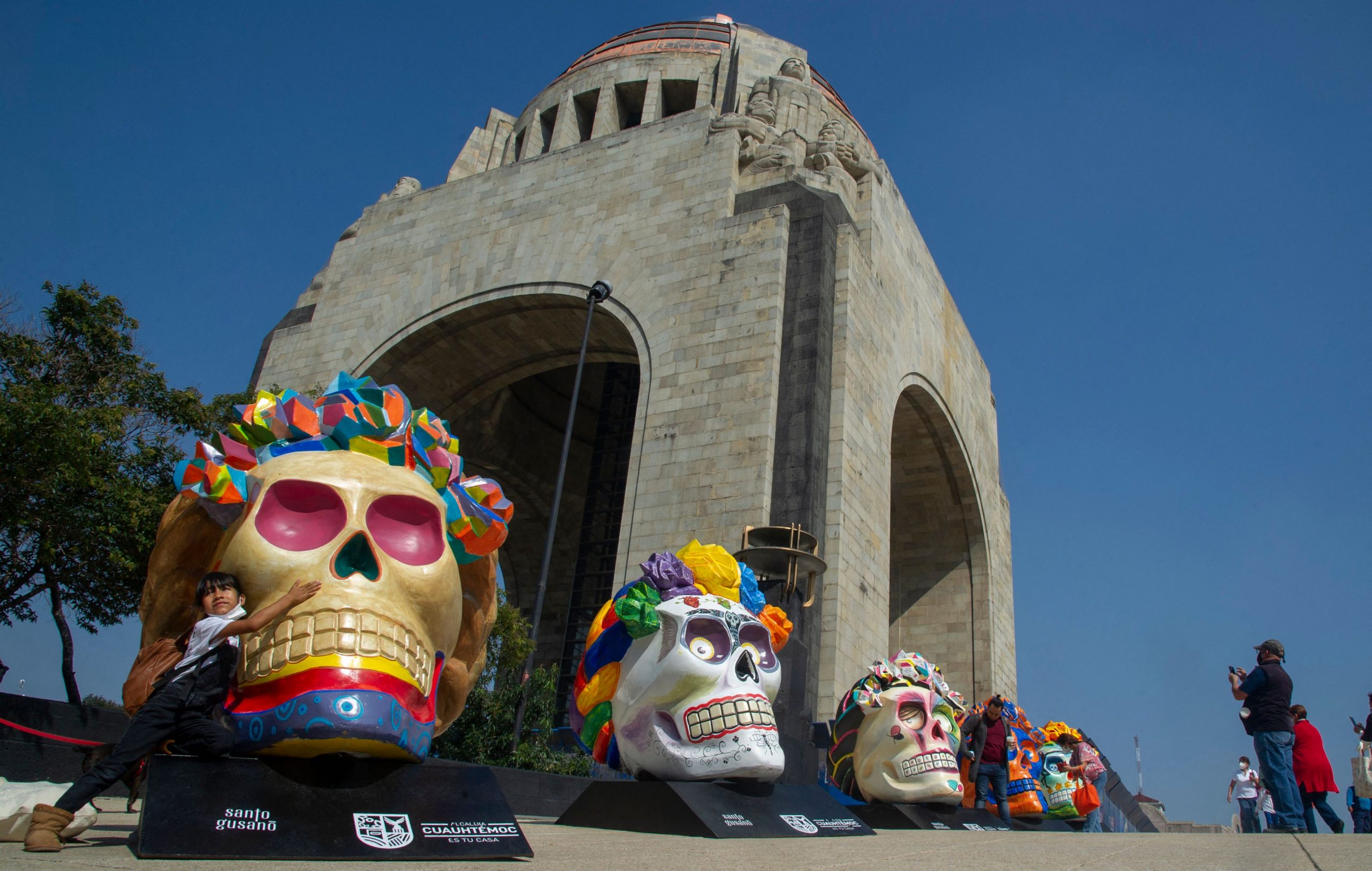 在墨西哥城革命纪念碑前的巨型头骨艺术装置,是为了纪念已故墨西哥艺术家——弗里达卡罗而绘制的。(法新社照片) 打开全文