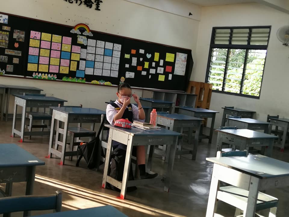 (关丹2日讯)学校复课频频传出冠病确诊病例,导致多所学校出席率下降,加叻华小一五年级班于昨天只有一名女学生到学校上课,与教师孤独相对。