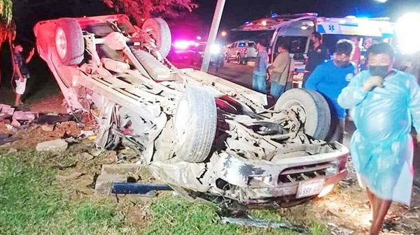 (泰国4日讯)沙缴府旺颂汶县一所中学前昨天发生严重车祸,一辆运载柬埔寨籍劳工的五十铃汽车疑因车速过快,加上司机不熟悉线路,从而在一处道路环岛转向时失控,猛烈撞击路边电线杆,车辆翻覆四轮朝天,整辆车几乎全部损毁,伤亡惨重,其中司机和5乘客当场死亡,另有8人受伤。更不幸的是,医师发现其中一名女性死者确诊冠病,旺颂汶县医院紧急通知参加救援的20多名志工尽快到医院做筛检。