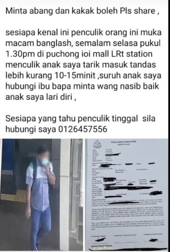 (八打灵再也4日讯)社交媒体流传一则贴文,指一名华裔男童在蒲种IOI购物广场的轻快铁站厕所遭一名男外劳企图掳拐的案件,警方澄清并非拐童案,涉案外劳只是向小童讨钱。