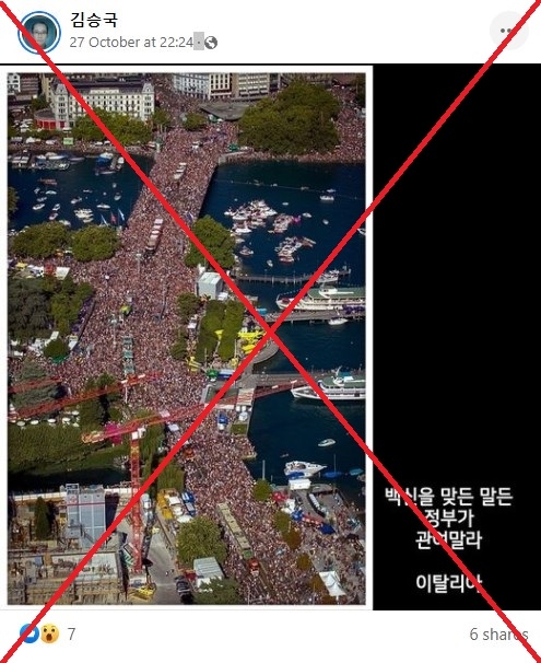 社交媒体近期流传一张民众上街示威的照片,声称是发生在意大利的反疫苗示威运动,照片旁有韩文写道:“意大利说,无论我们是否接种疫苗,政府都不会参与。”