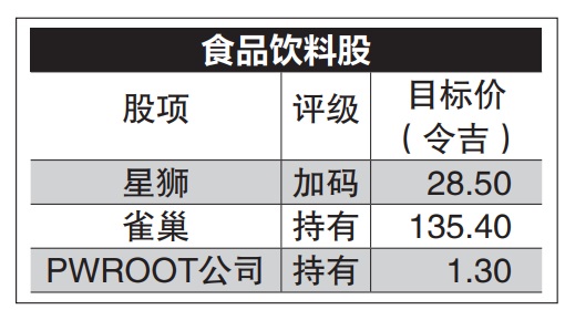 联昌建议“加码”星狮(F&N,3689,主板消费产品服务组),专精于饮料与牛乳饮料,目标价28令吉50仙。至于PWROOT公司的75%产品为即溶饮料产品,目标价1令吉30仙。