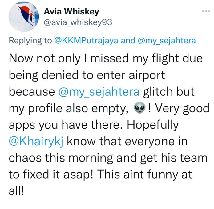 “现在我不仅因为MySejahtera的故障而被拒绝进入机场,从而错过了我的航班,我的个人资料也是空白的!你们有很好的应用程式。希望凯里知道今早每个人都因此陷入混乱,并让他的团队尽快修复!这一点都不好笑!”