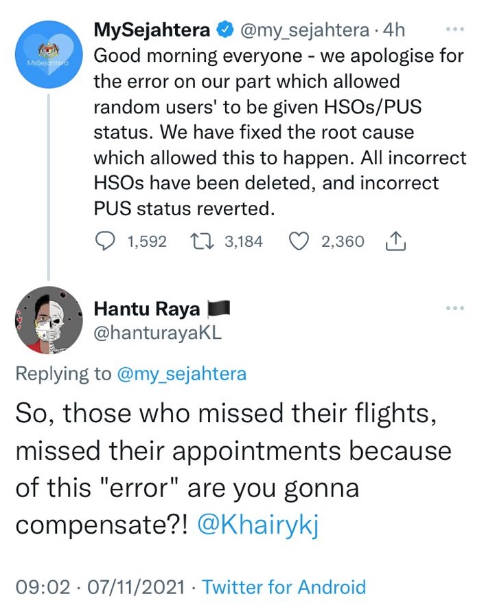 名为“Hantu Raya”的网民则质问MySejahtera和凯里说:“所以,那些因为这个‘错误’而错过航班、错过预约的人,你们会给予补偿吗?”