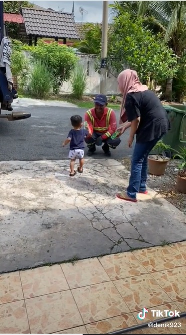(八打灵再也7日讯)负责倒垃圾的清洁工人虽然工作环境肮脏,但却为人们营造了干净的生活环境,一名蹒跚学步的宝宝在父母的鼓励下,站在家门前向清洁工人道谢,还为他们送上盒装美禄,在网上引起好评。