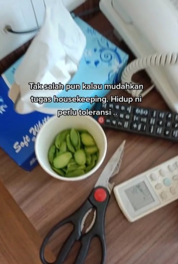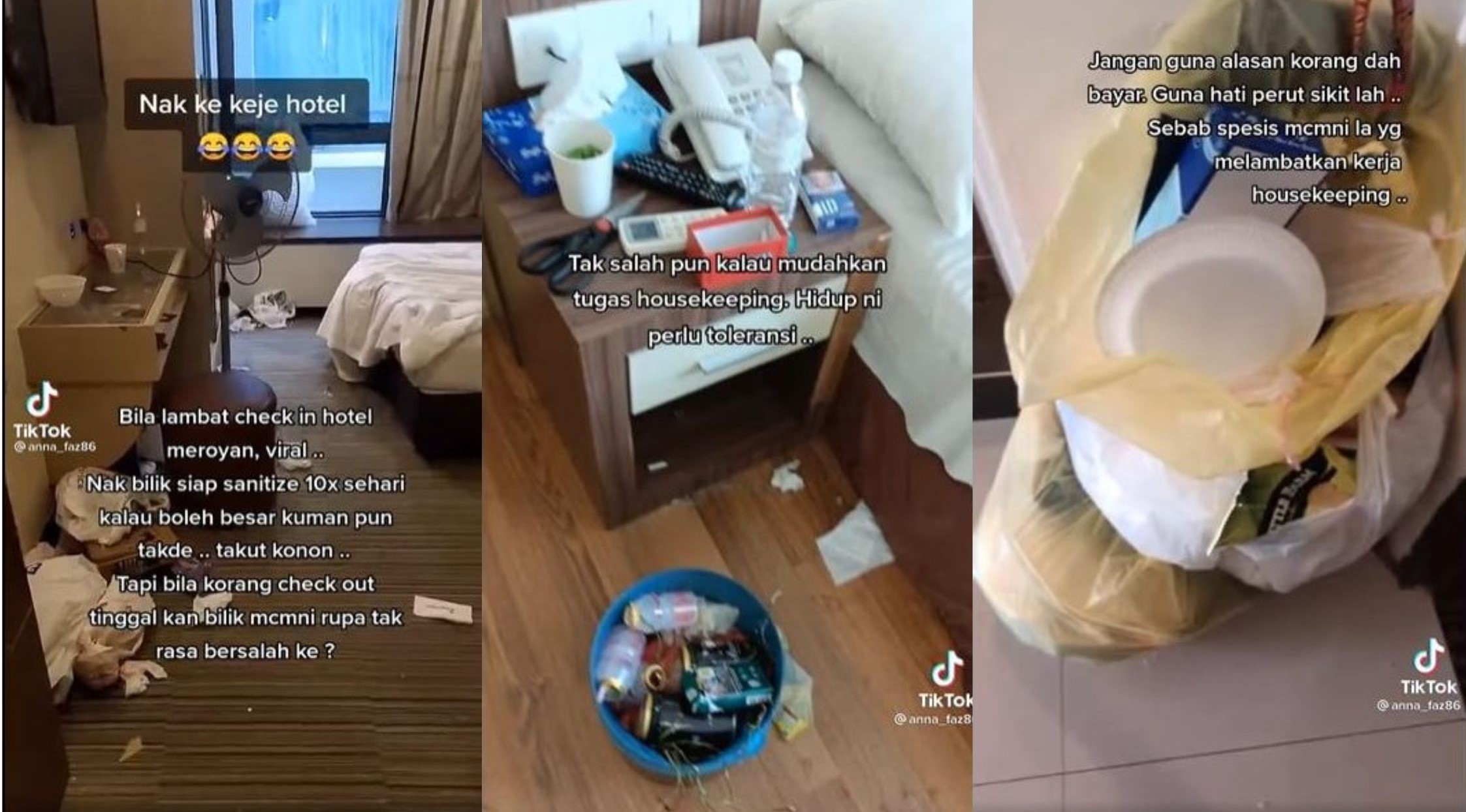 一名相信是酒店工作人员的女子anna_faz86昨日在TikTok上传了一段视频,可见房间地毯四处都是垃圾、床单被掀起、将毛巾丢在厕所地板上、甚至还带榴莲进房间食用并把榴莲壳留在桌子。