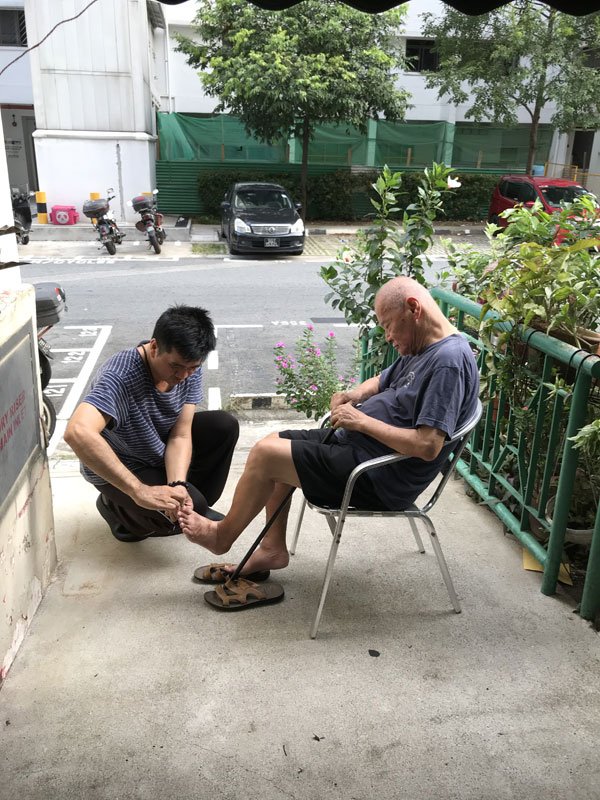 (新加坡7日讯)老吾老以及人之老!餐馆女老板发现八旬男顾客的指甲又长又脏,于是请店里厨师帮忙。厨师二话不说,在店前帮老人家修剪手指甲,甚至弯蹲着帮他剪脚趾甲,这一幕被拍下放上网后获网民赞扬。