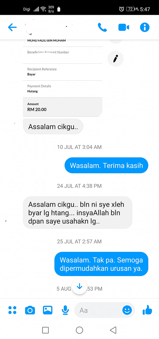 一名国小老师借210令吉给一名素未谋面的妇女,但对方却很有诚信,每月都还数十令吉给他,即便只有能力还7令吉,也坚持还钱。