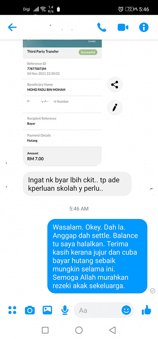“有时还10令吉,有时还20令吉,曾经有一次还了50令吉,还有一次因为没钱还,主动联系我,跟我说抱歉。”
