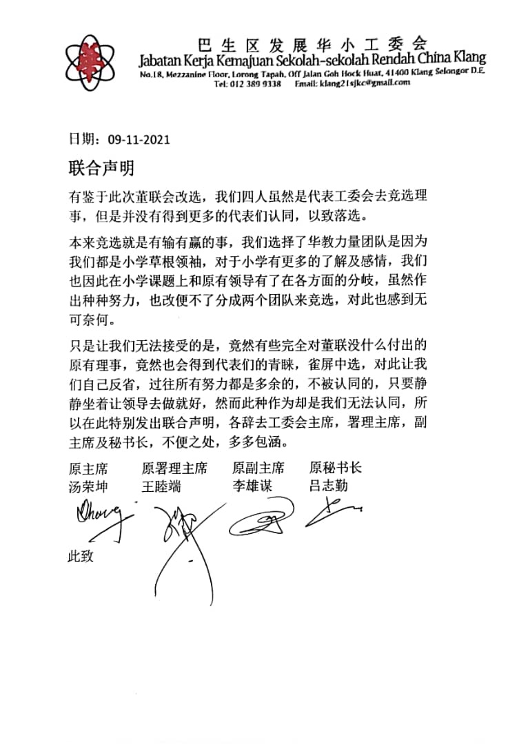 联合声明指出,有鉴于此次雪隆董联会改选,他们4人虽然是代表巴生区发展华小工委会去竞选理事,但是并没有得到更多的代表认同,以致落选。