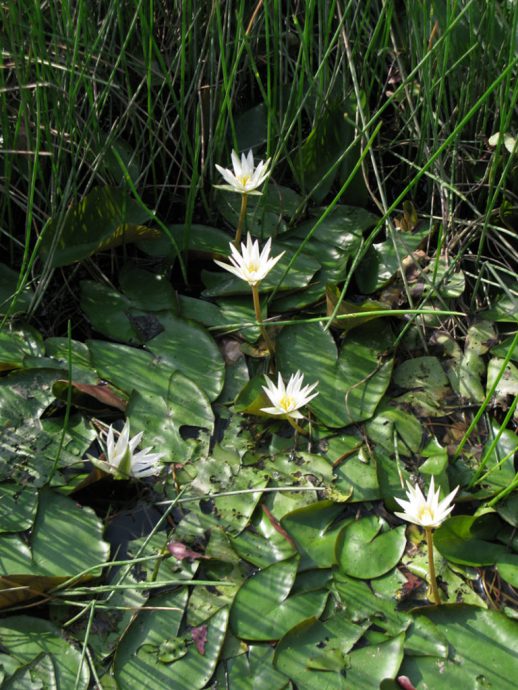 渠道里第二常见的植物是睡莲(学名Nymphaea sp.)。它的根部长在水底的土层里,而埋于深水处的块根或种苗刚冒出的新叶通常会是水中叶,叶子沉在水里而不会冒出水面,叶形呈大波浪状。待植株长大一些后,它们长出的叶子才会浮于水面,形成浮水叶。