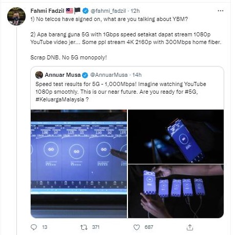 通讯及多媒体部长丹斯里安努亚慕沙昨日在推特发文分享我国进行了5G速度测试,不过他在帖文中举的例子反遭到国会议员和网民毫不留情的批评和打脸。