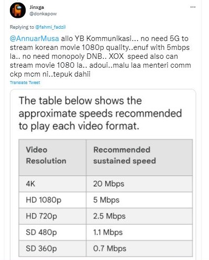 网民直接打脸说:“部长,要看1080p画质的韩剧根本不需要5G,5mbps的网速就足够了。不需要DNB的垄断。XOX说电讯的网速都能看1080p的电影了啦……通讯及多媒体部长讲出这种话有点丢脸。”