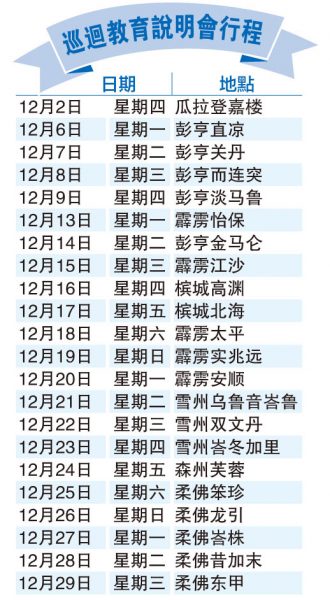 上述巡回教育说明会将在雪州、霹雳、槟城、彭亨、登嘉楼、森州及柔佛等地以实体方式举行,确实地点由当地主办单位公布,各场时间则统一在晚上7时30分入场。
