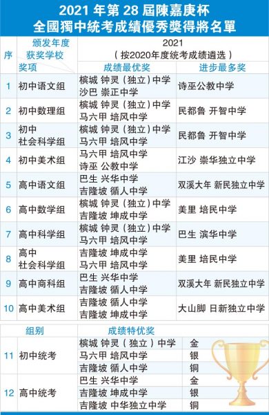 高中组的3所得奖学校皆是陈嘉庚杯全国独中统考成绩优秀奖的常胜军,而获得本届初中组金银铜奖的学校则都是首次得奖。