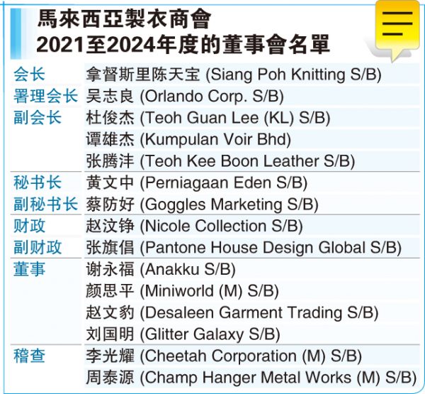 (吉隆坡13日讯)马来西亚制衣商会(MGMA)于日前召开本年度会员大会,并改选新届董事会,拿督斯里陈天保蝉联会长职,吴志良则被选为署理会长。