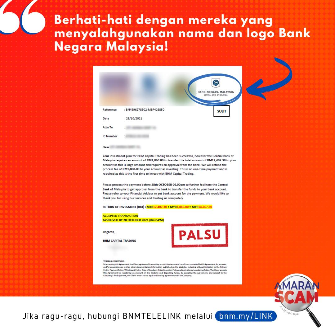 Amaran Scam提到,如果民众有所怀疑,可与透过bnm.gov.my/LINK联系BNMTELELINK,以进行投报或获得确认。