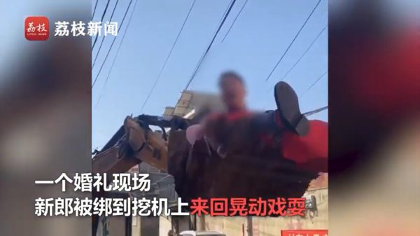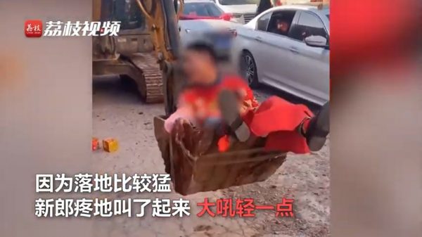 (北京14日讯)中国又传夸张“婚闹”行径,河南洛阳一名新郎被绑在挖土机上下晃动,而正上方就是电线,险象环生!