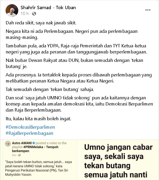 他今日针对慕尤丁发表“按一个键”就能解散柔佛州议会,促巫统勿挑战他撤回对柔州政府的支持的言论,在脸书贴文回应。