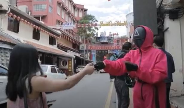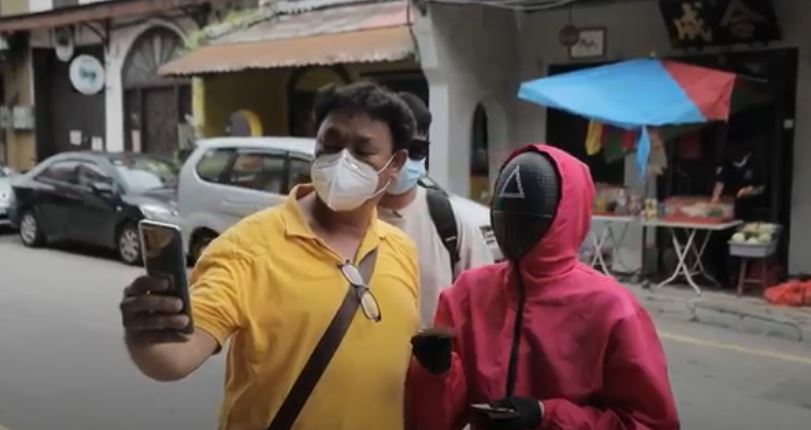 鸡场街周日下午出现一位韩剧“鱿鱼游戏”中的经典角色,手握希盟版的鱿鱼游戏卡片派给各民众,透过吸睛有趣的形式呼吁选民于11月20日回家投票。