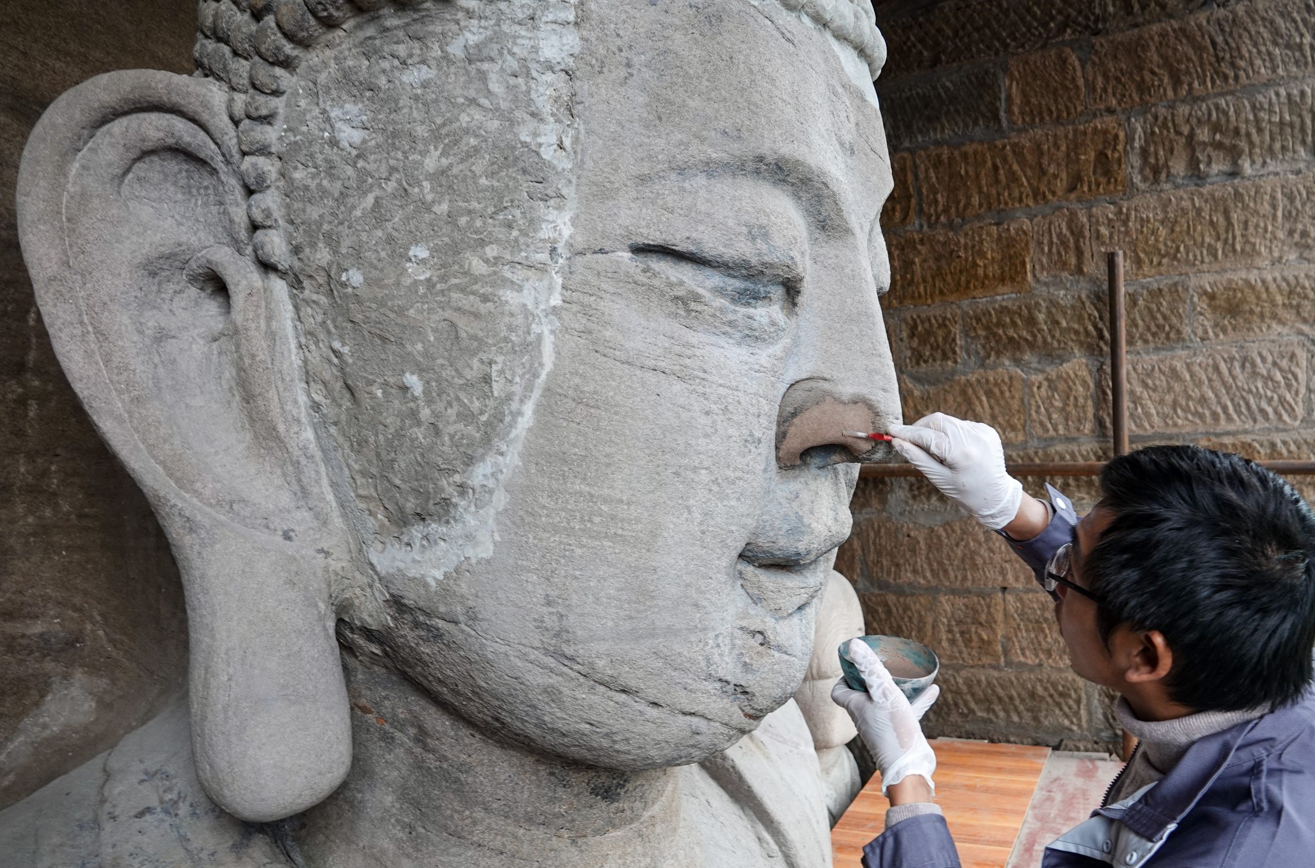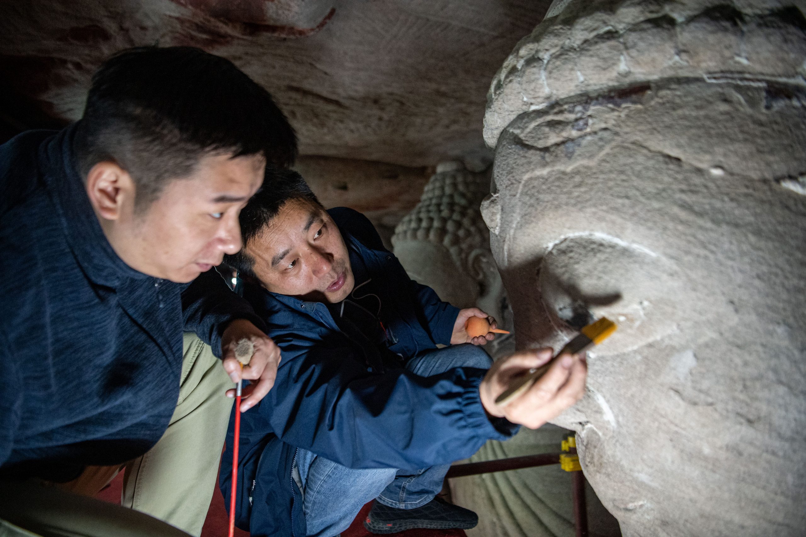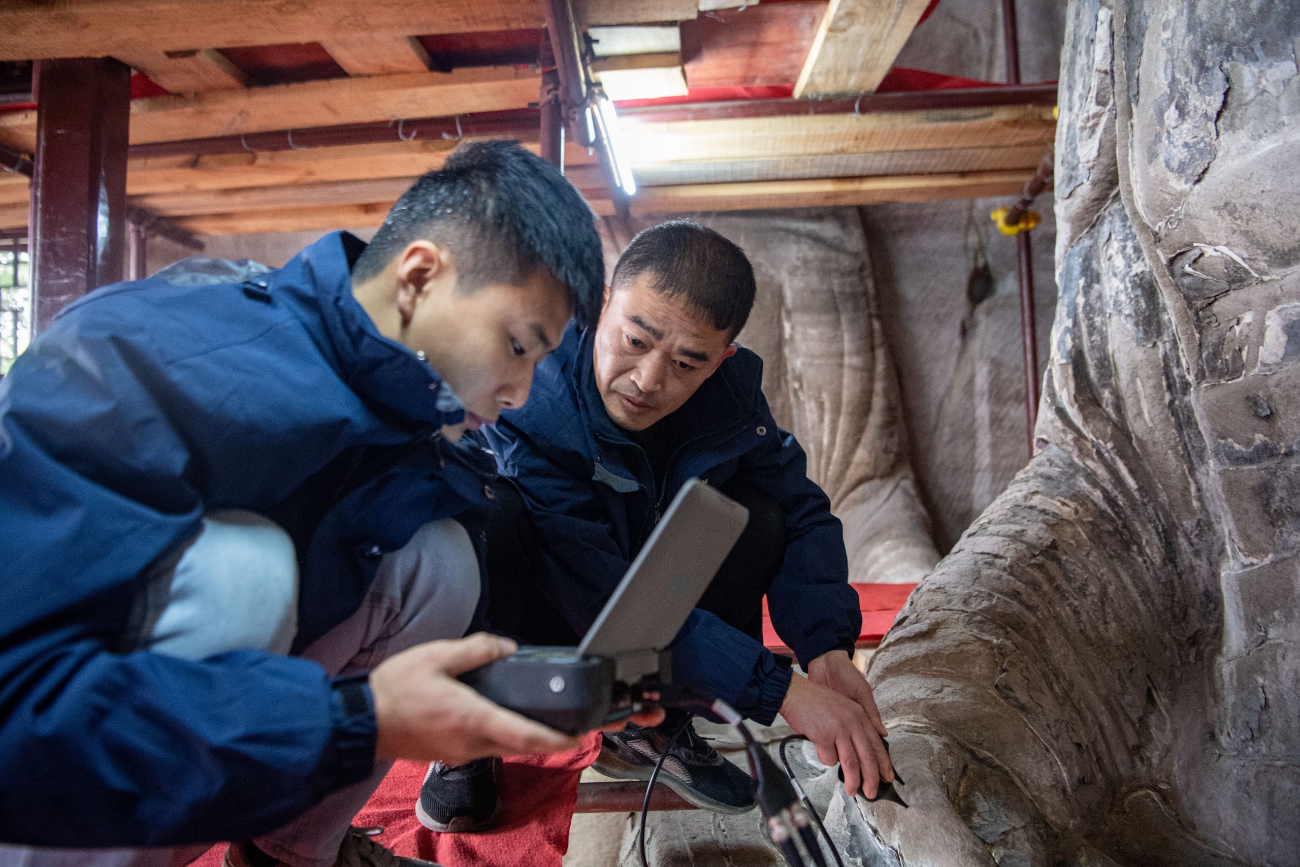下一步,修缮团队将实施第二阶段修缮工程,开展造像彩绘、金箔层病害治理,佛龛、题刻修复,以及大佛阁修复等工作。