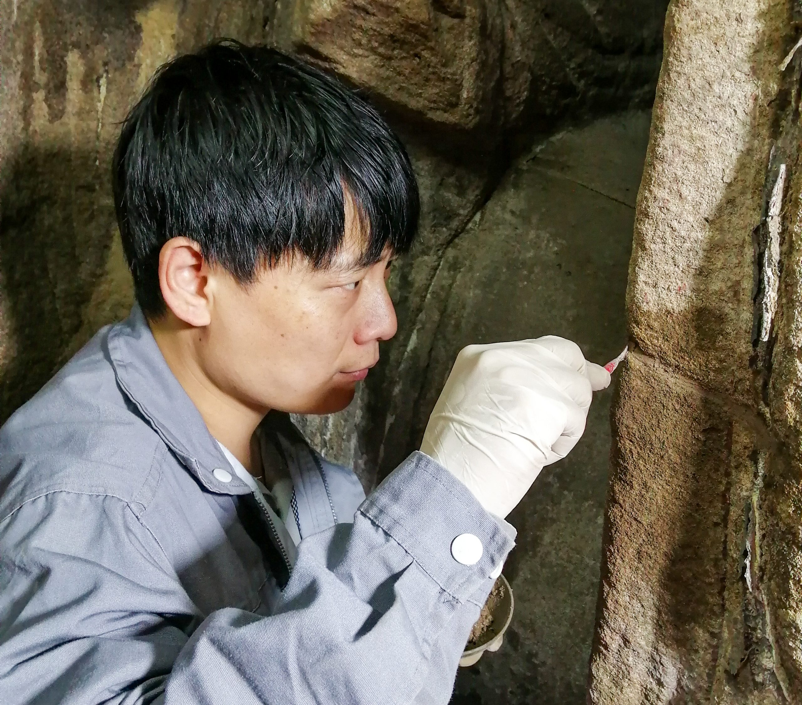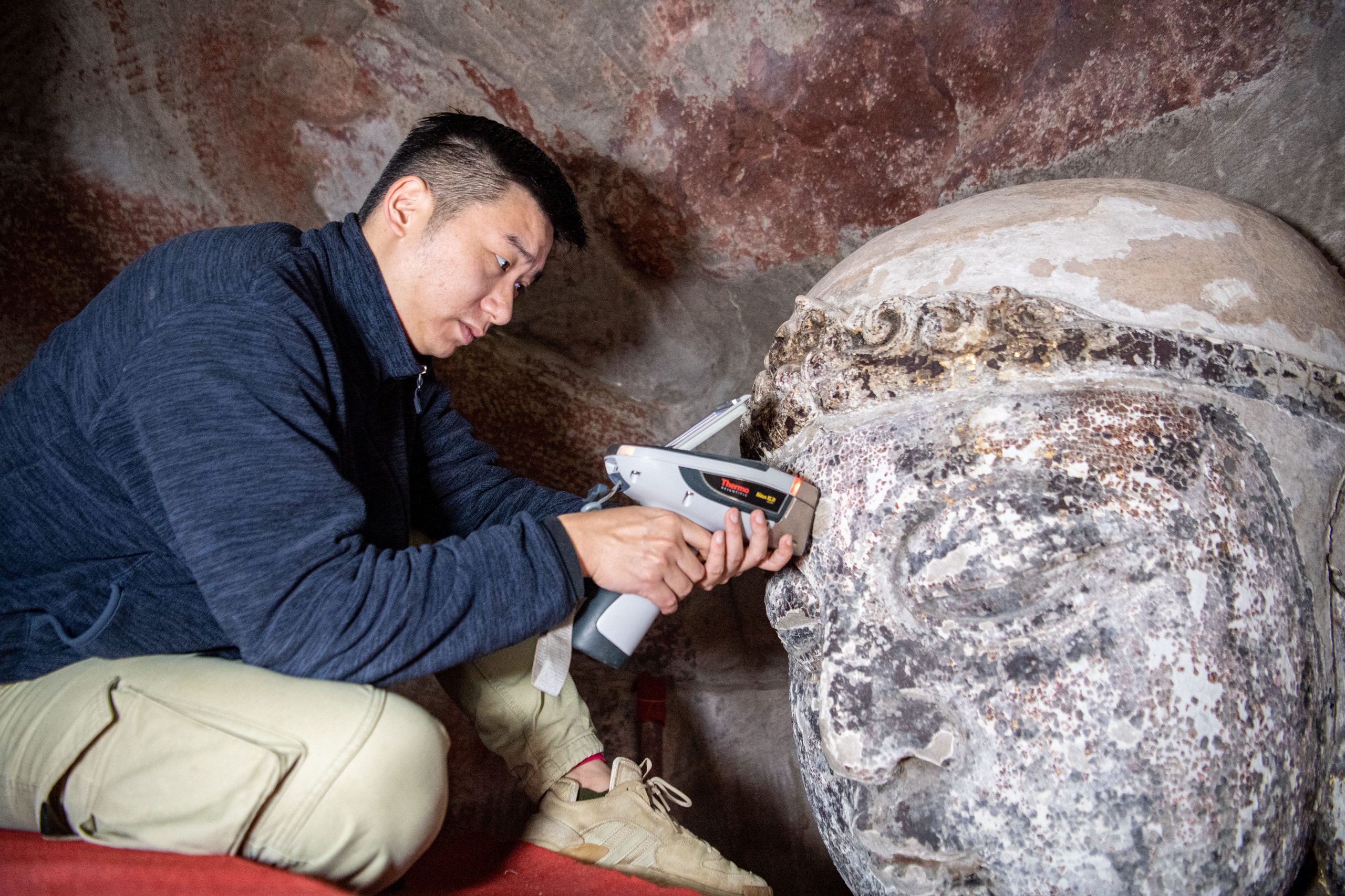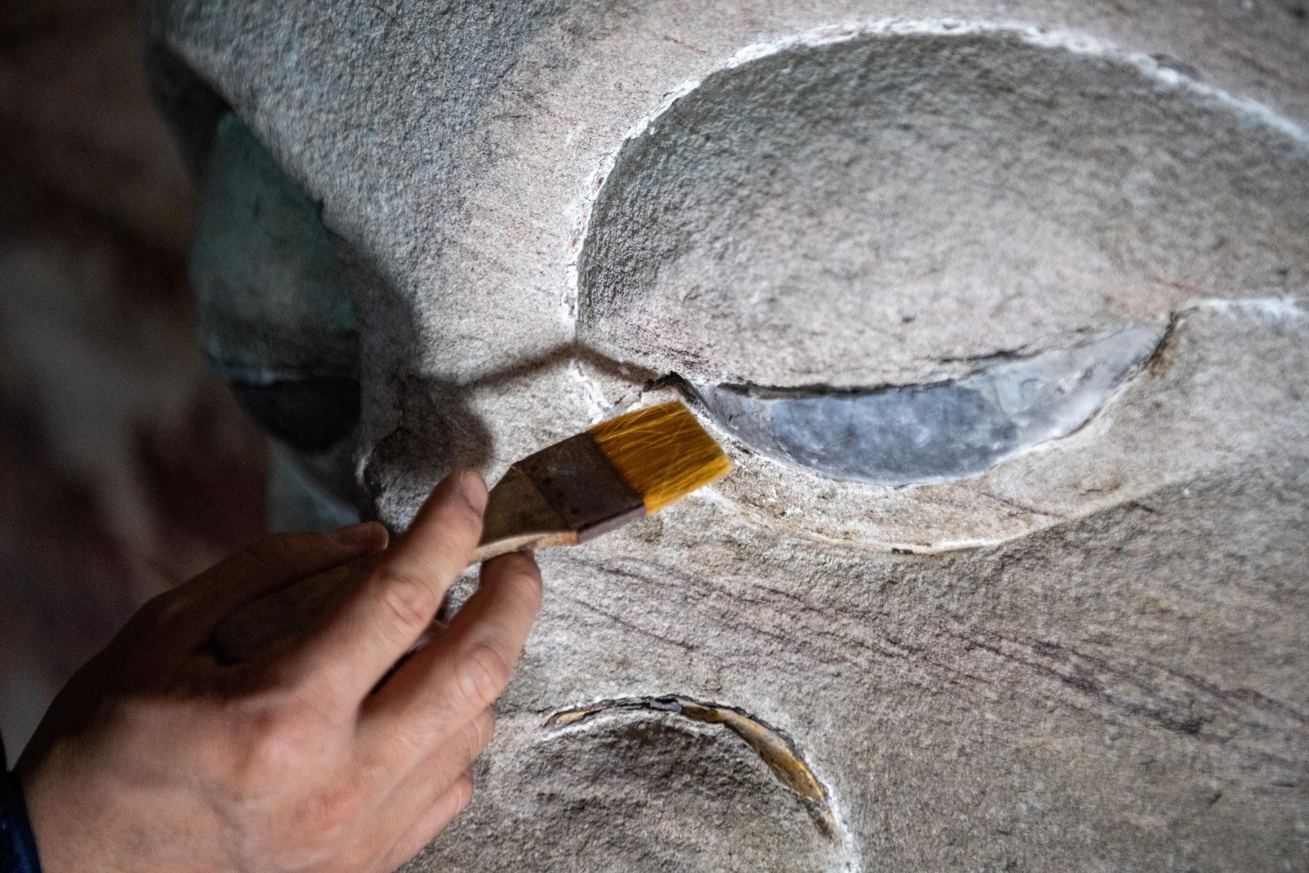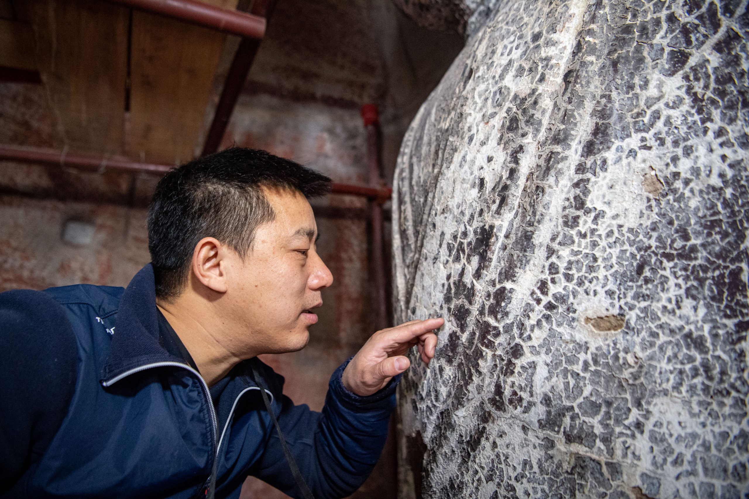 近七个世纪以来,这尊造像受潮湿环境、气候等因素影响,出现了不同程度的空鼓、开裂、金箔脱落等问题。2016年,该处文物被国家文物局纳入首批“川渝石窟示范项目”,并由中国文化遗产研究院的修缮团队负责实施修缮。
