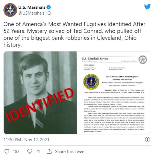调查半世纪以来未有进展,直至法警局调查人员早前注意到一则“兰德尔”的报纸讣闻后顺藤查证,始发现此人正是改名为“Thomas Randele”的康拉德。他犯案后曾逃往华盛顿和洛杉矶,最后定居距犯罪现场1000公里的波士顿郊区隐姓埋名,未再犯罪。
