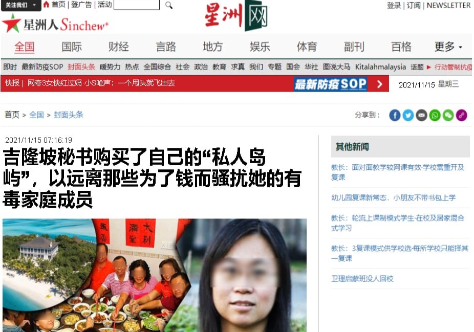 该赌博网站以“吉隆坡秘书购买了自己的‘私人岛屿’,以远离那些为了钱而骚扰她的有毒家庭成员”为题撰写文章,声称一名30岁的秘书Joanne Jin因“网络游戏”中奖,赢得33万令吉并在热浪岛置产。