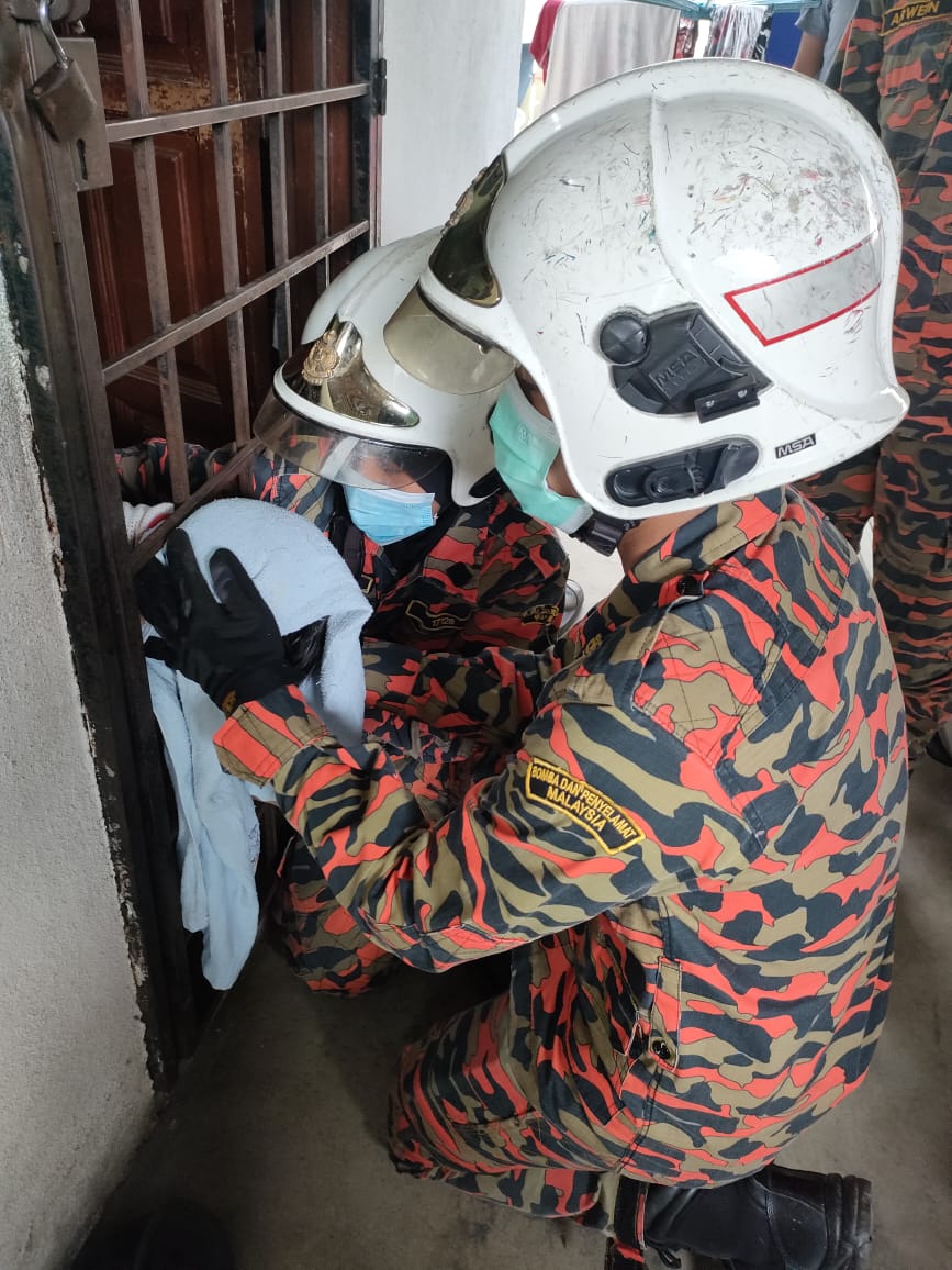 (八打灵再也16日讯)一名2岁男童疑贪玩将头伸出铁花门结果卡住,劳动消防及拯救人员上门施救。