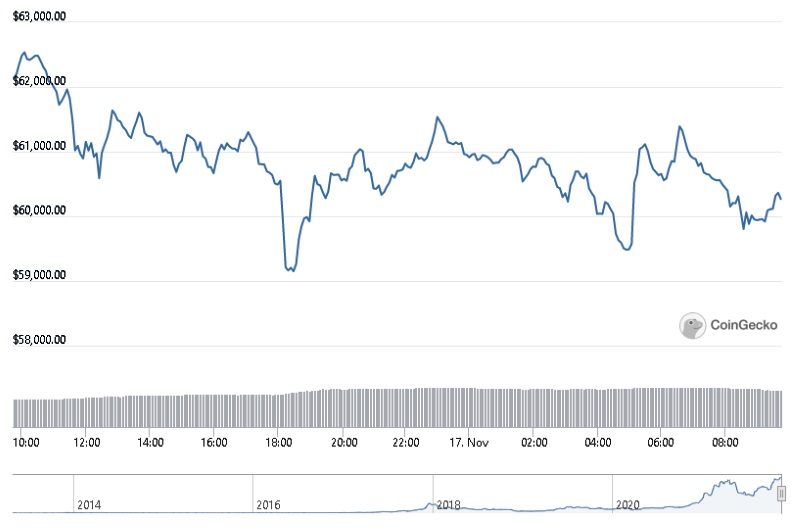 比特币隔晚曾跌最多8.2%,是9月24日后最大跌幅度,低见58661.07美元,是10月28日57976.82美元后最低,直至截稿为止,报60155.18美元,跌3%,连续跌4日,累计跌4538.84美元,对上一次连续跌4日是7月20日。