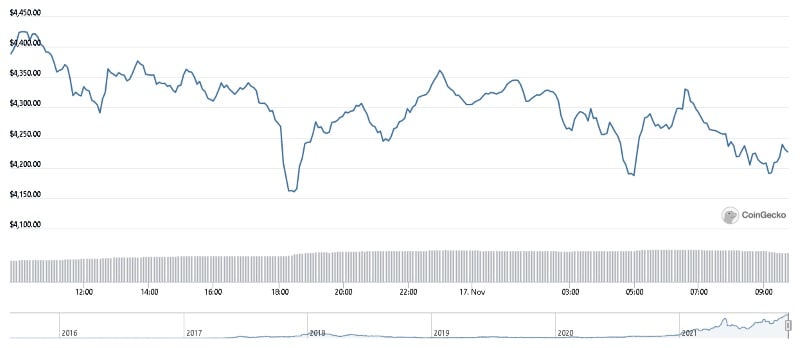 第二大加密货币以太坊隔晚亦曾跌超过10.09%,直至截稿为止,报4224.94元,跌3.9%。