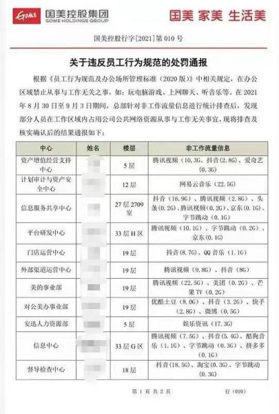 (中国·北京17日讯)近日,中国国美控股集团发布《关於违反员工行为规范的处罚通报》称,在8月30日-9月30日期间,国美总部针对非工作流量信息进行统计排查後,发现部份员工在工作区域内占用公司公共网络资源从事与工作无关事宜,如:玩电脑游戏丶上网聊天丶听音乐等。