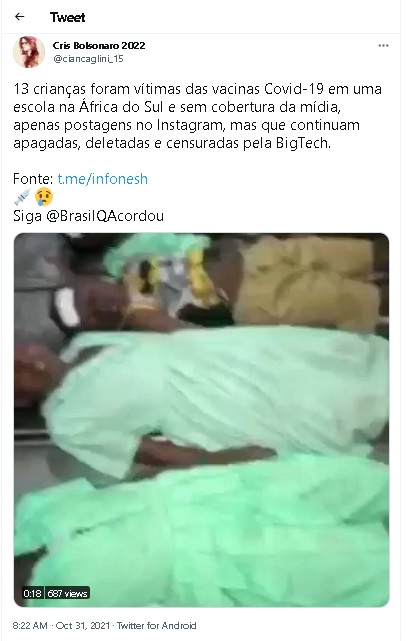 日前社交媒体流传一段仅18秒的视频,声称有南非有13名儿童因为接种了冠病疫苗而死亡,该视频配上文字写道:“在南非的一所学校中,有13名儿童死于疫苗,但全球范围内的电视频道均未提及此事,仅在Instagram上发布了一些相关帖子,但他们立即删除”。