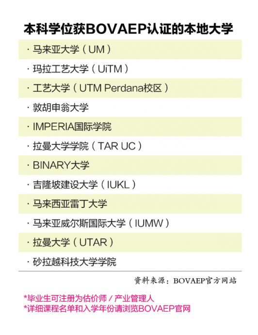 根据BOVAEP今年9月发布的名单,本地总共有12所大专的产业管理课程受到BOVAEP认证,另有37所澳洲、纽西兰、新加坡和英国大学的课程受承认。这些课程的学生毕业后可申请注册成为准估价师,详情可到BOVAEP官网查询,官网清楚列明哪些课程和哪些年份的毕业生符合申请资格。*